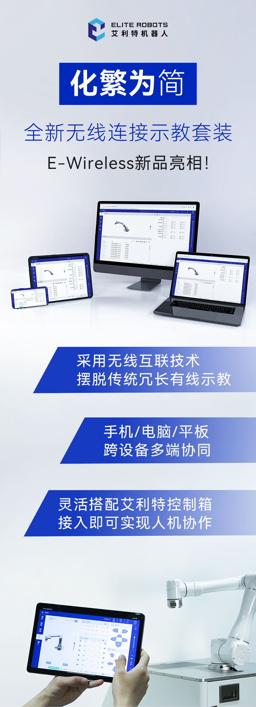面对医疗、新零售、食品等行业对示教方式和示教器存放空间较为苛刻的应用场景,AG庄闲针对示教模式重新优化,推出了基于浏览器的WebUI示教软件。针对现代工业复杂多变以及日益增长的特殊场景需求,搭配AG庄闲标准控制箱或超薄MINI控制箱,构成的精妙组合——全新E-Wireless无线示教套装正式亮相!