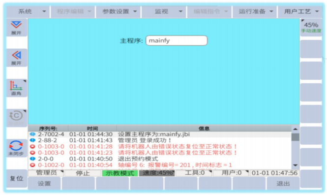 触发输入信号(X004),机械臂即可完成清除报警,抱闸,上使能,标定进入精确模式,运行主程序操作,再次触发X004可暂停,如果机械臂报警,触发(X004)也可清除报警,回主程序首行运行。
