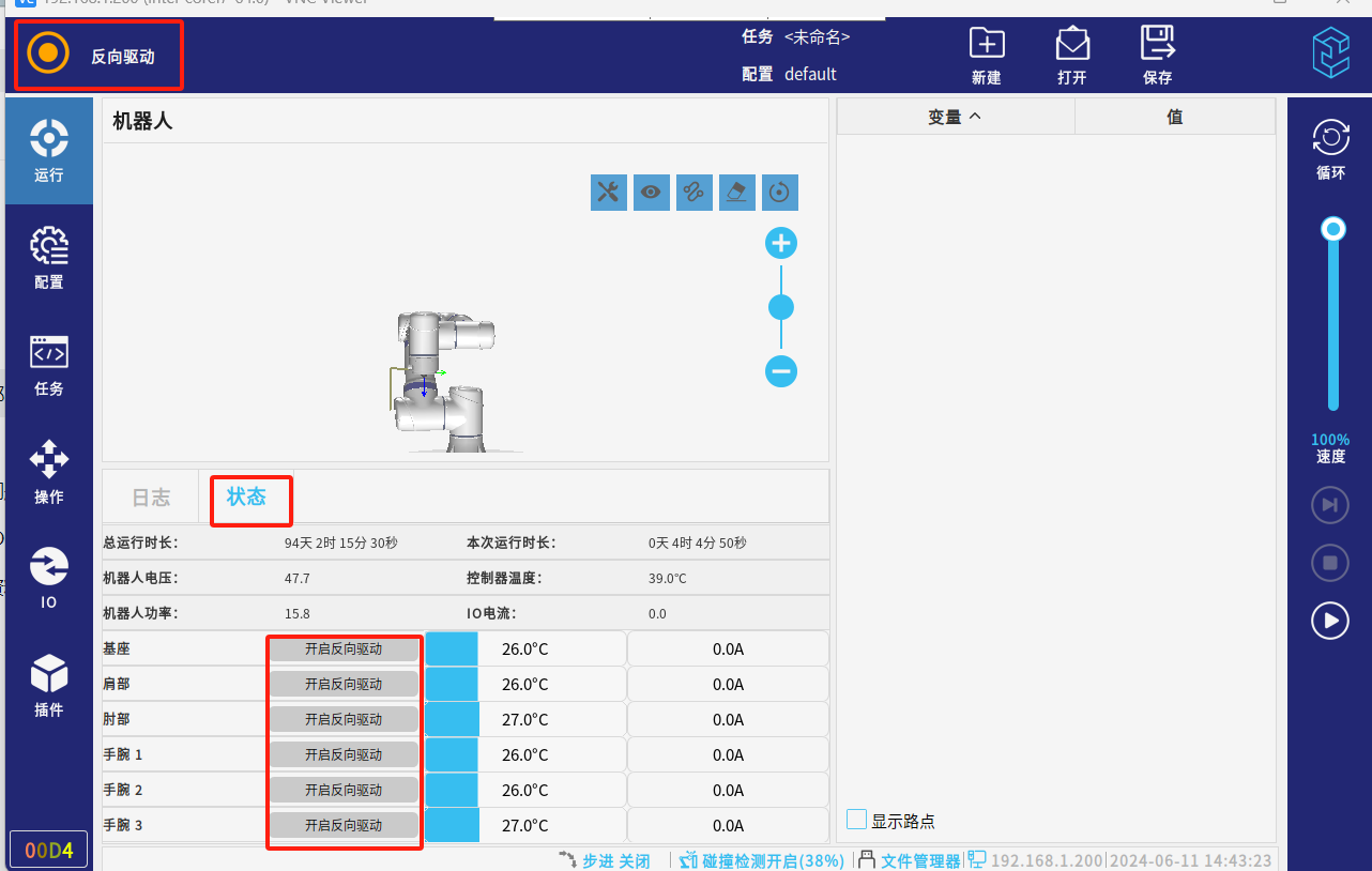 ● 开启反向驱动后,电机释放抱闸机器人对应关节,此时关节在重力的作用下,会正常下滑。开启反向驱动前,必须做好安全防护,防止由于重力向下移动损坏设备。