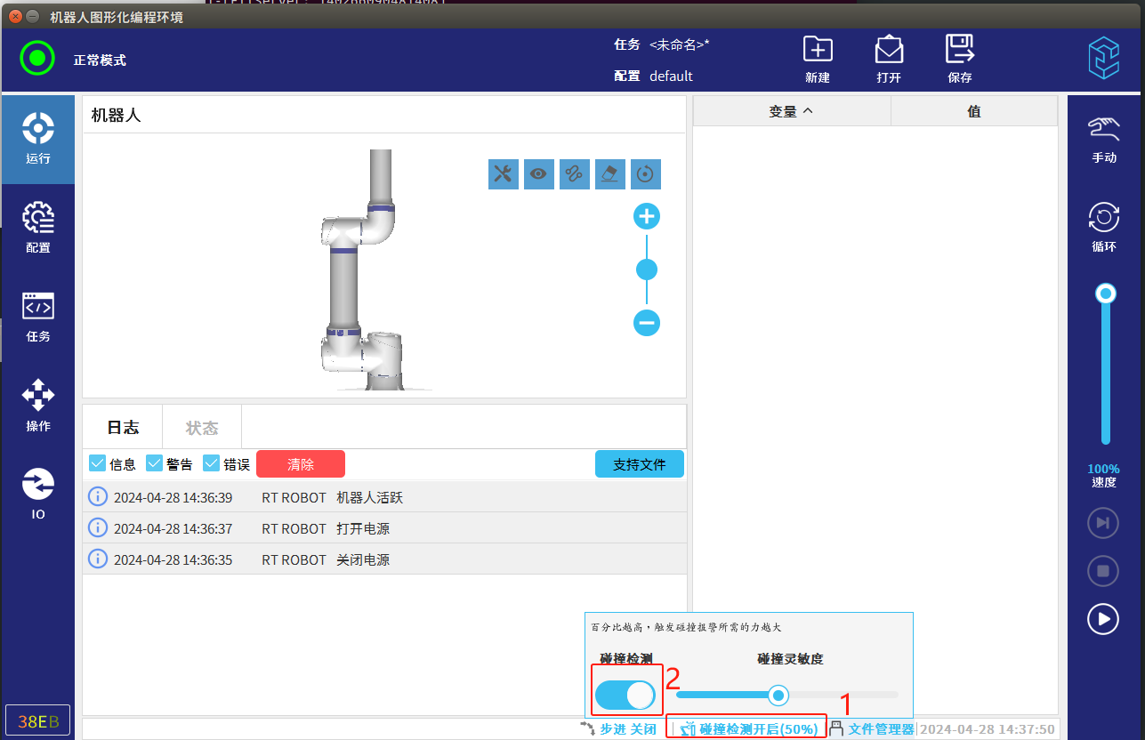 ● 关闭碰撞检测时,必须尽可能减小机器人的运动速度移出碰撞区域,以避免不可预知的碰撞损伤。解决后需把碰撞检测开启。