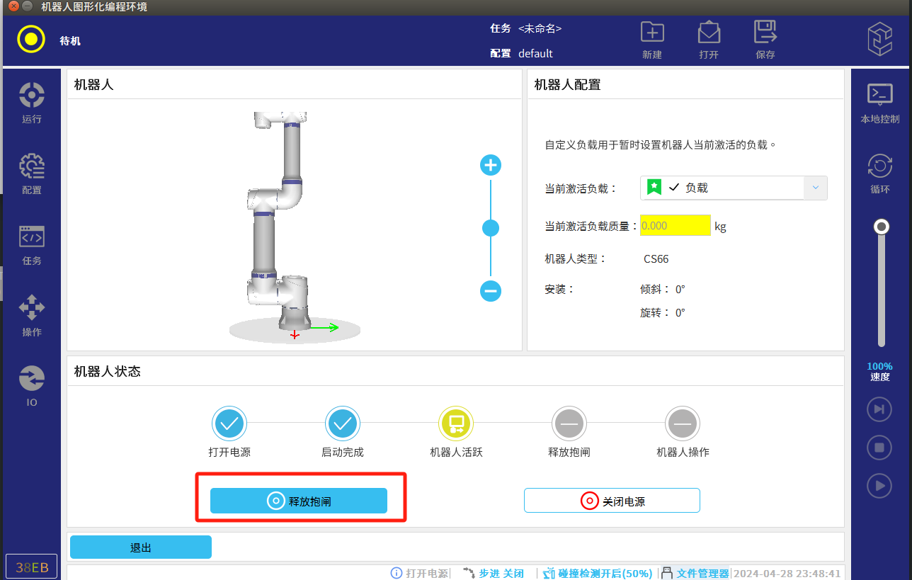 ● 将机器人移动到安全区域内,然后点击 “释放抱闸“。等待页面左上角显示“正常模式”,机器人可正常使用。