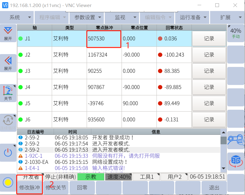 将套圈超限的关节角度置零位 先用手机对零点界面拍照,把六个关节的零点脉冲都拍照记录下来。然后在示教器上对套圈超限关节点击记录。这时该关节角度会变成零点位置的角度,且该关节的零点脉冲值会改变,机器人可以手动运行。