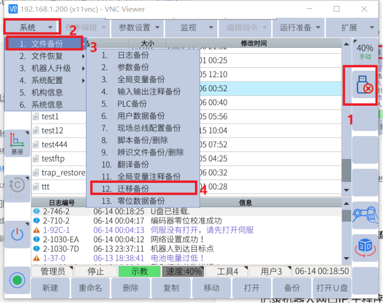 将U盘插入控制柜USB接口,确保U盘正常识别,示教器界面点击系统-文件备份-备份用户数据备份及全局变量备份。记录机器人网口IP,主程序名。(单独记录)