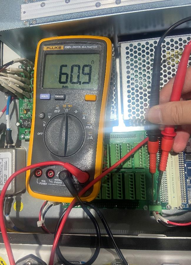 4. 万用表测量控制柜 I/O 板上 485 母座和本体端子阻抗都为 120 欧姆左右为正常值(两端连接阻抗值各60 欧),若 I/0 板端阻抗值异常可能是 I/0 板故障。