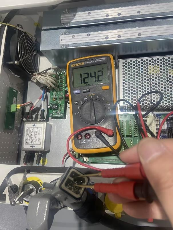 6.  拆开端盖检查1轴驱动板上指示灯是否正常亮起和测量电压是否正常48v。如电压不正常可能是电源线缆或驱动板电源芯片故障导致无法正常供电。棕线端子是48V,黑线端子是GND。