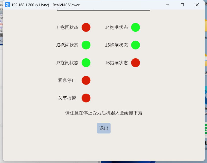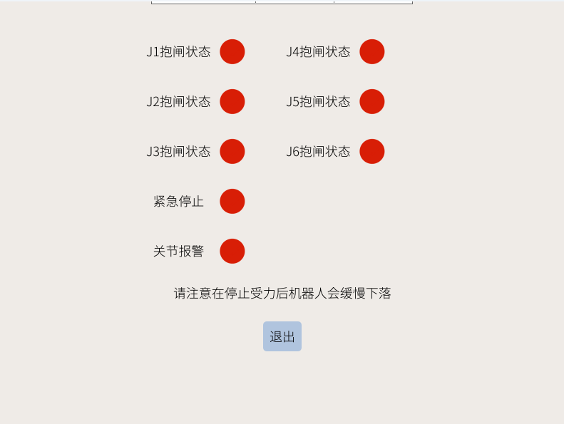 在该状态下如果不扶好机器人,松开抱闸关节会缓慢重力向下掉落。当机器人反向驱动脱离卡死后应该点击退出。