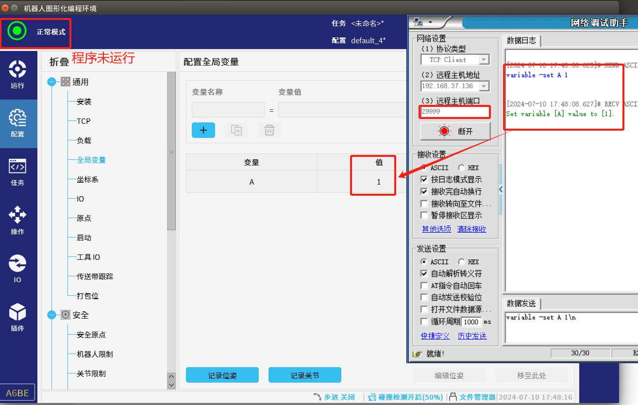 1. 程序未运行时只能通过29999端口修改全局变量,程序运行时只能通过30001端口修改全局变量。