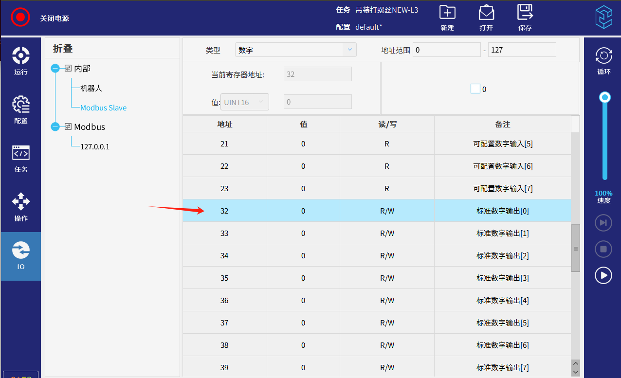 • 前期准备:1.机器手做为modbus从站并已通信上。2.已安装I/O高级配置