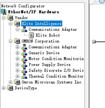 5、 在文件夹OMRON中的Communications Adapter找到对应的plc型号的文件,双击文件既可加入中间栏,在从Elite Intelligence中找到机器人eds描述文件,双击文件既可加入中间栏