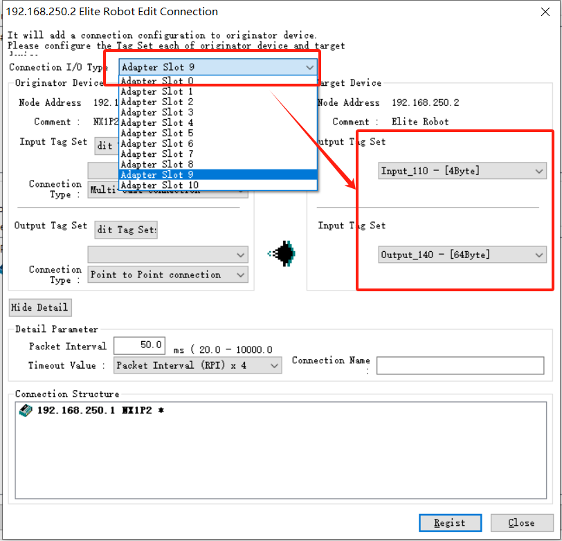 7、 出现下图既可查看对应插槽的目标变量以及需要配置的字节大小,下图中表示的就是插槽9,对应plc输出目标变量140变量大小64byte,输入目标变量110变量大小4byte。