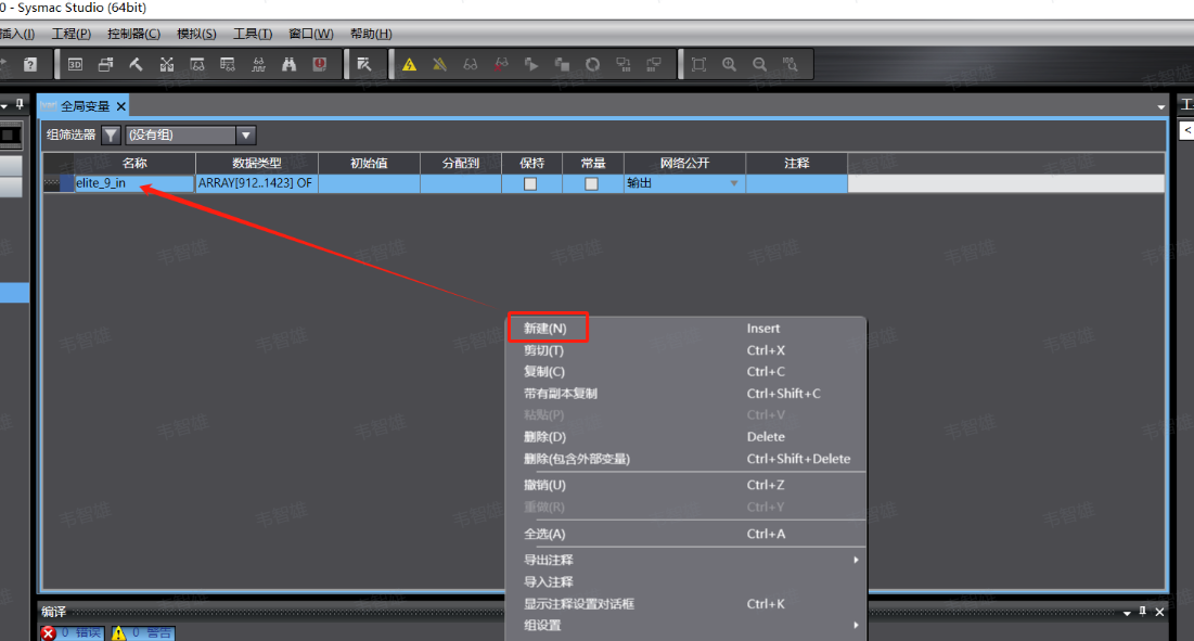 10、 由于每个插槽都有对应输入输出,所以设置完输出还需要输入,点击空白处,新建全局变 量,在数据类型中填入ARRAY[0..31] OF BOOL,网络公开设置成输入状态