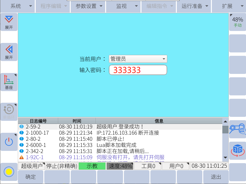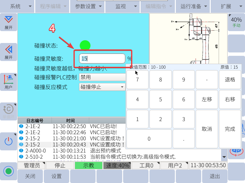 tips:机器人开启碰撞检测后,灵敏度设置的越小,代表机器人越灵敏,触发机器人“碰撞检测报警”所需要的力便越小,碰撞检测是检测电流的大小,灵敏度设置过高,易引发碰撞报警误报,可根据实际情况,设置合适的灵敏度值。