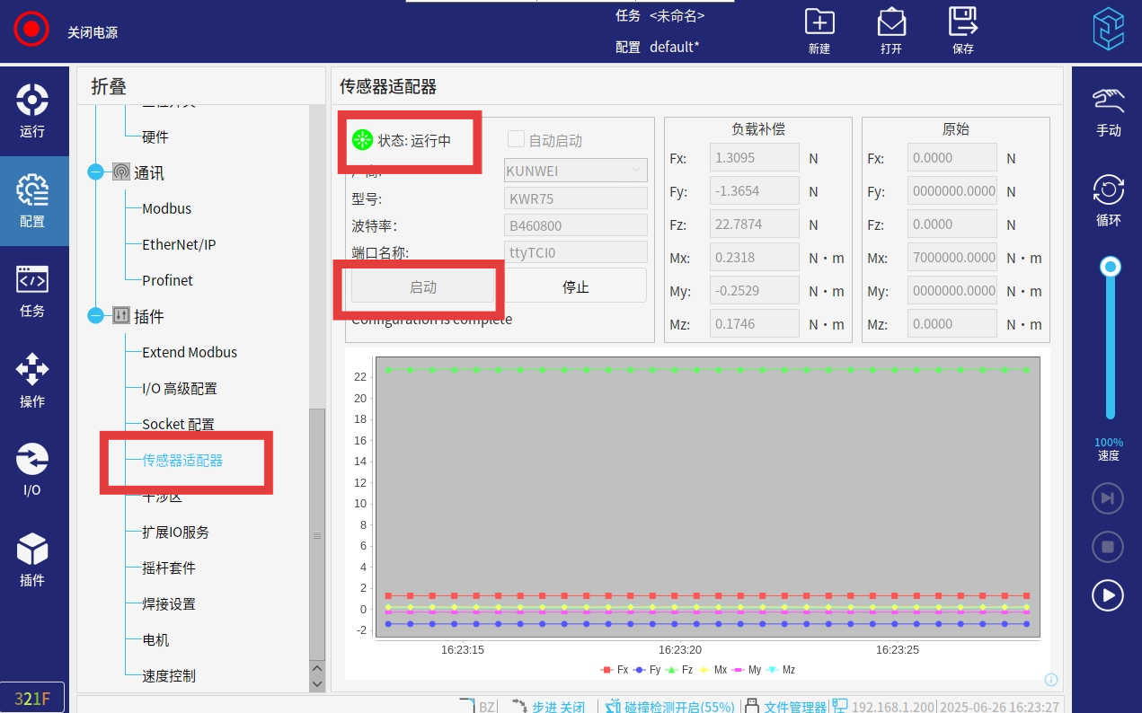打开力控插件后,需检查一下负载补偿与原始数据,是否正常,如果不正常,需要做力传感器标定。也可以稍微给力传感器外部施加力,检查负载补偿是否有数据,如果没有数据,也是说明不正常。
