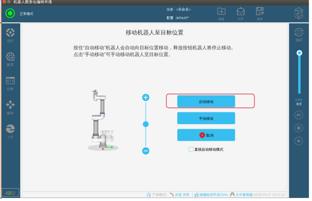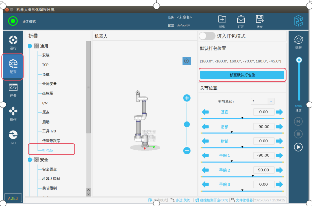 第三步:退出专家模式,这个时候因为伺服报警已经屏蔽了,所以机器人可以正常上电了。如图-3所示在配置界面→选择打包位→点击移至默认打包位就可以进入图-4界面。