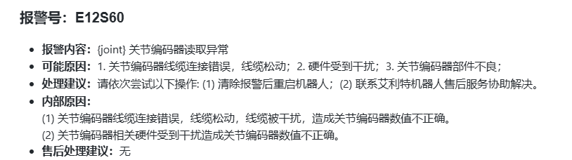 2.  数字释义:“12” 指代伺服报警;“60” 明确为 {joint} 关节编码器读取异常。