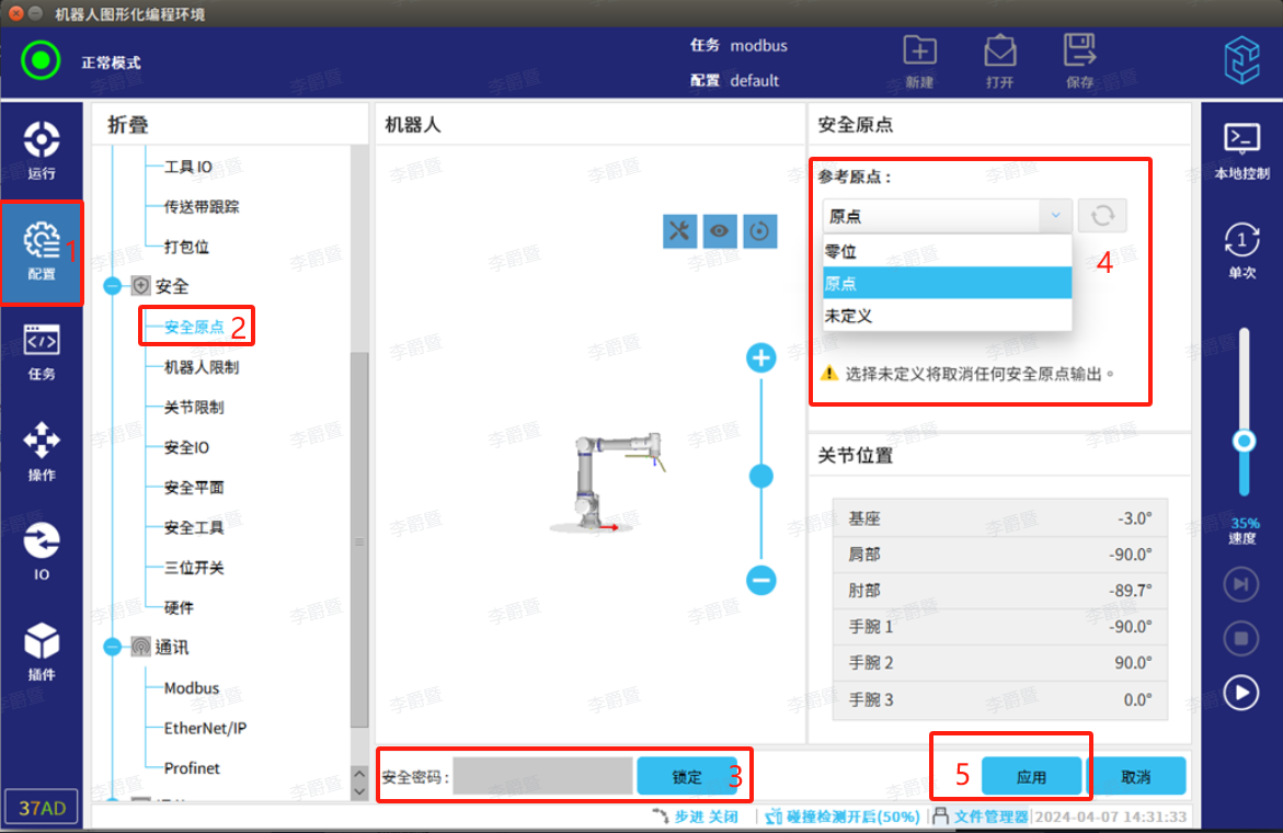 3. 配置modbus信号为安全原点信号输出,要求:应用版本要求2.11及以上,IO/高级配置插件版IOExtensionConfig-1.2.11.1及以上(modbus通讯机器人作为主站时建议使用)