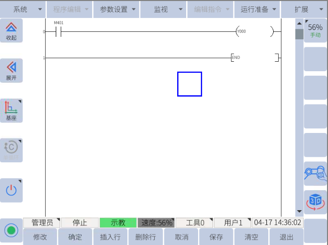 机器人进入管理员权限(密码:333333),导航到扩展 -> 用户PLC,使用梯形图关联M401和需要输出的数字IO