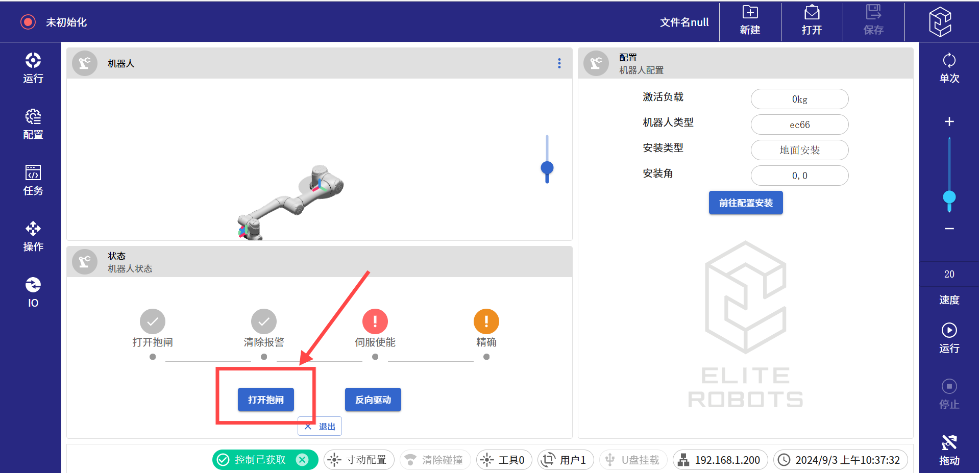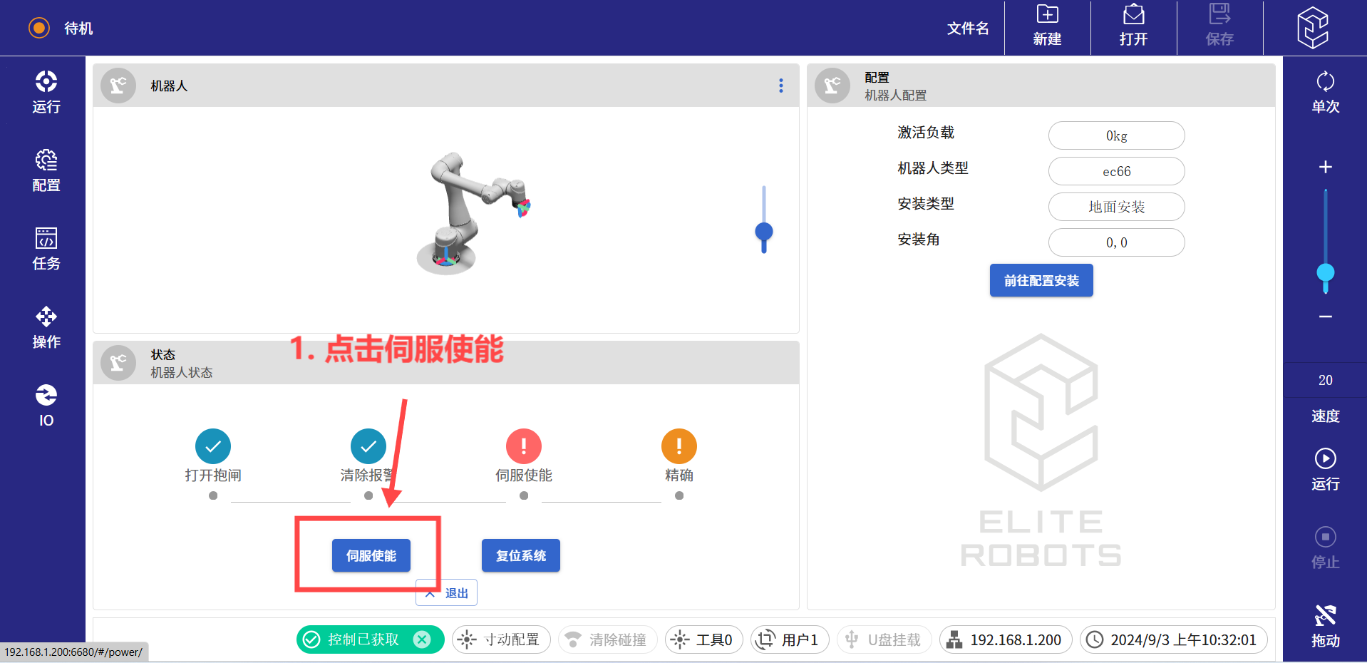(6)进入待机界面后,依次点击打开抱闸,伺服使能,以及精确。如果使用的是迷你控制柜,第一步还有一个机械臂上电的按钮,点击上电按钮继续往下执行即可。