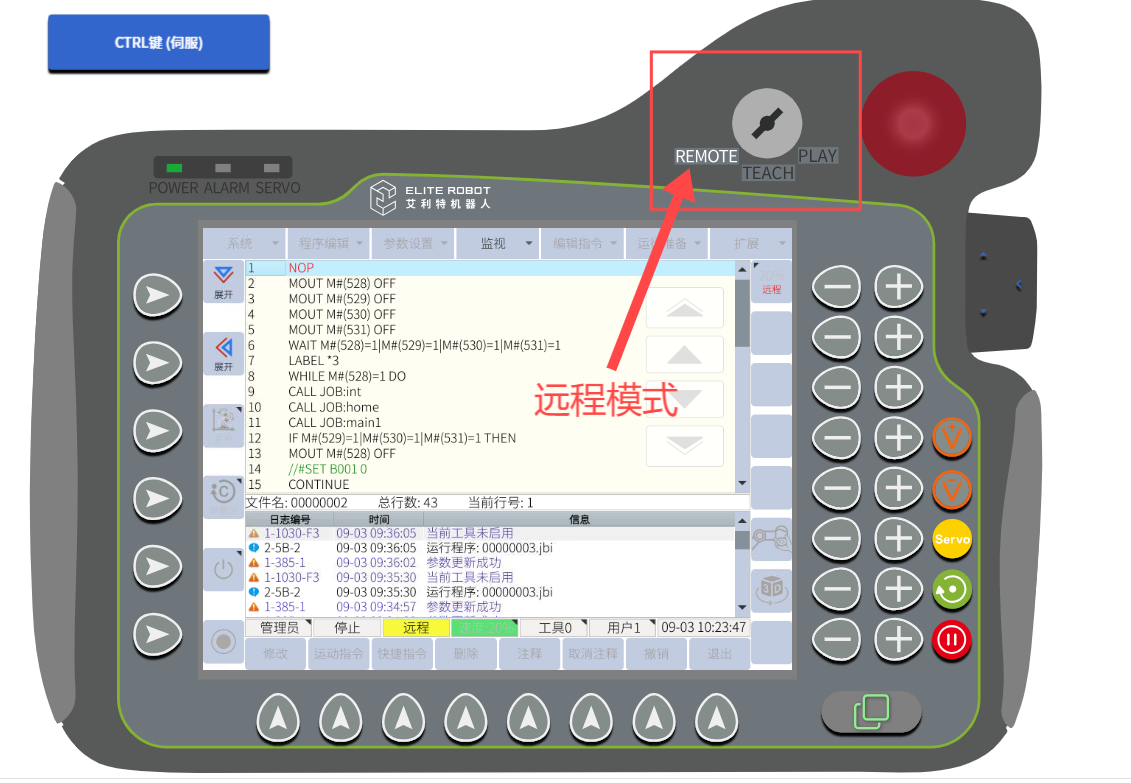 (5)如果机械臂报警提示“机械臂未进入远程模式”或者“示教器连接状态未断开”需进行如下操作(示教器插头已拔出)。进入网页版示教器后,需点击下方获取控制按钮,获取机械臂控制权限,否则机械臂无法操作。然后点击右上角的设置界面,打开VNC,然后点击参数设置>控制器设置>示教器连接状态,把示教器连接状态改为断开。